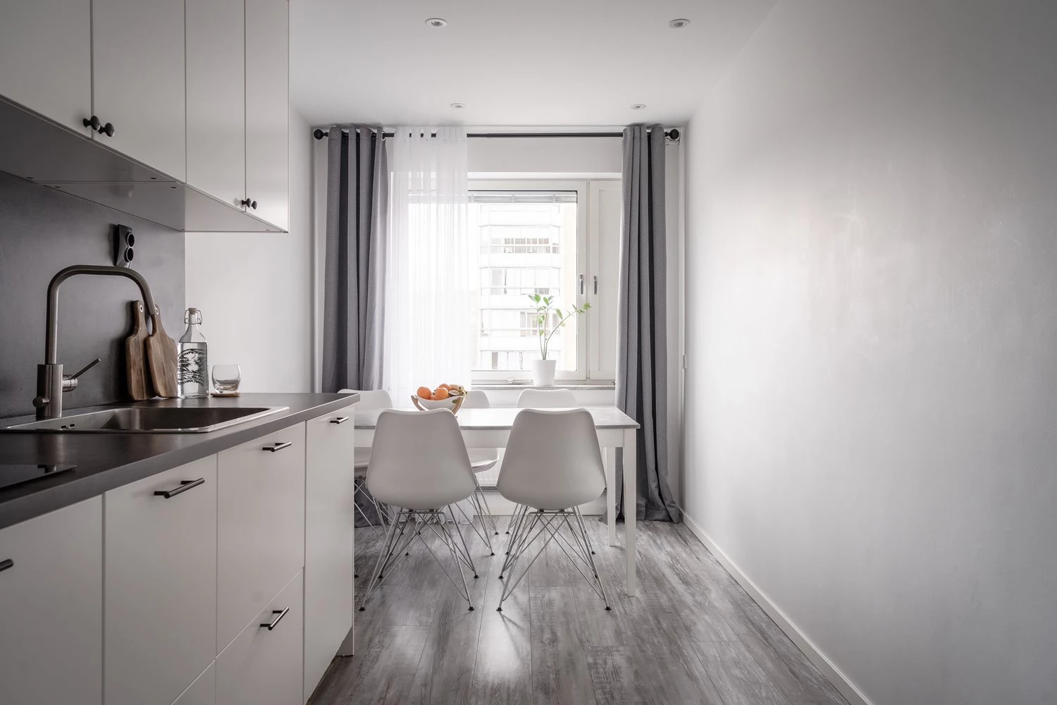 laminatgolv och vita väggar. Köksluckor i vitt samt bänkskiva i grå laminat. Köket är utrustat med kyl/frys, ugn, micro, spishäll, fläkt samt integrerad diskmaskin. Här finn plats för matbord för 4-6 personer.