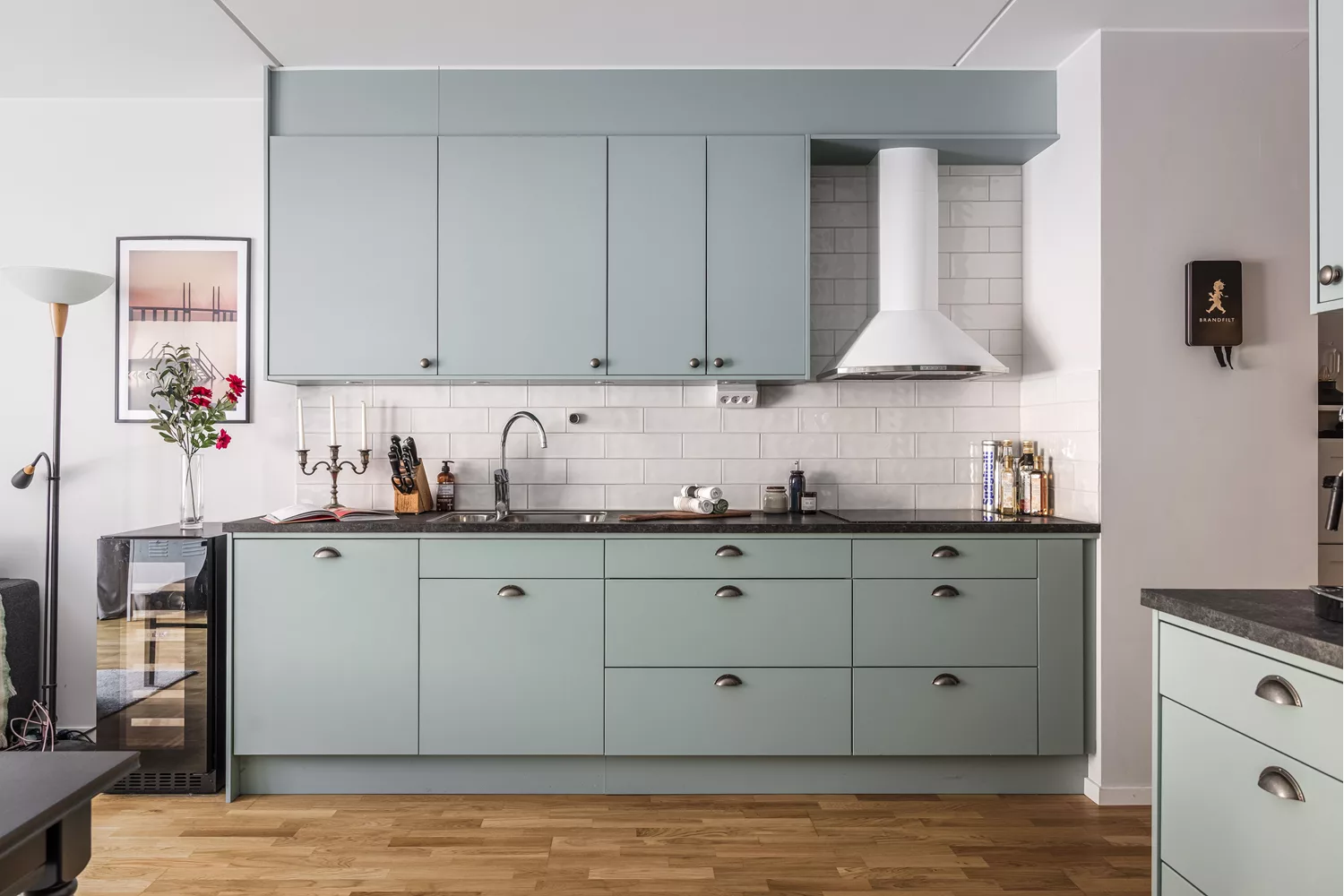 Parkettgolv och väggar i ljusgrå nyans. Kök med många tillval, bland annat den blå/grå nyansen på luckorna, vitvaror m.m. Fullt utrustat kök med diskmaskin, ugn, mikro, spishäll, kyl/frys, fläkt och ugn.