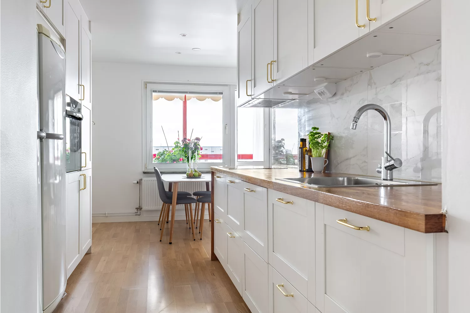 Parkettgolv och vita väggar. Köket är i vitt utförande och är utrustat med kyl, frys, diskmaskin, ugn, spis samt fläkt. Här finns plats för matbord för 4-6 personer. Från köket nås bostadens inglasade balkong.