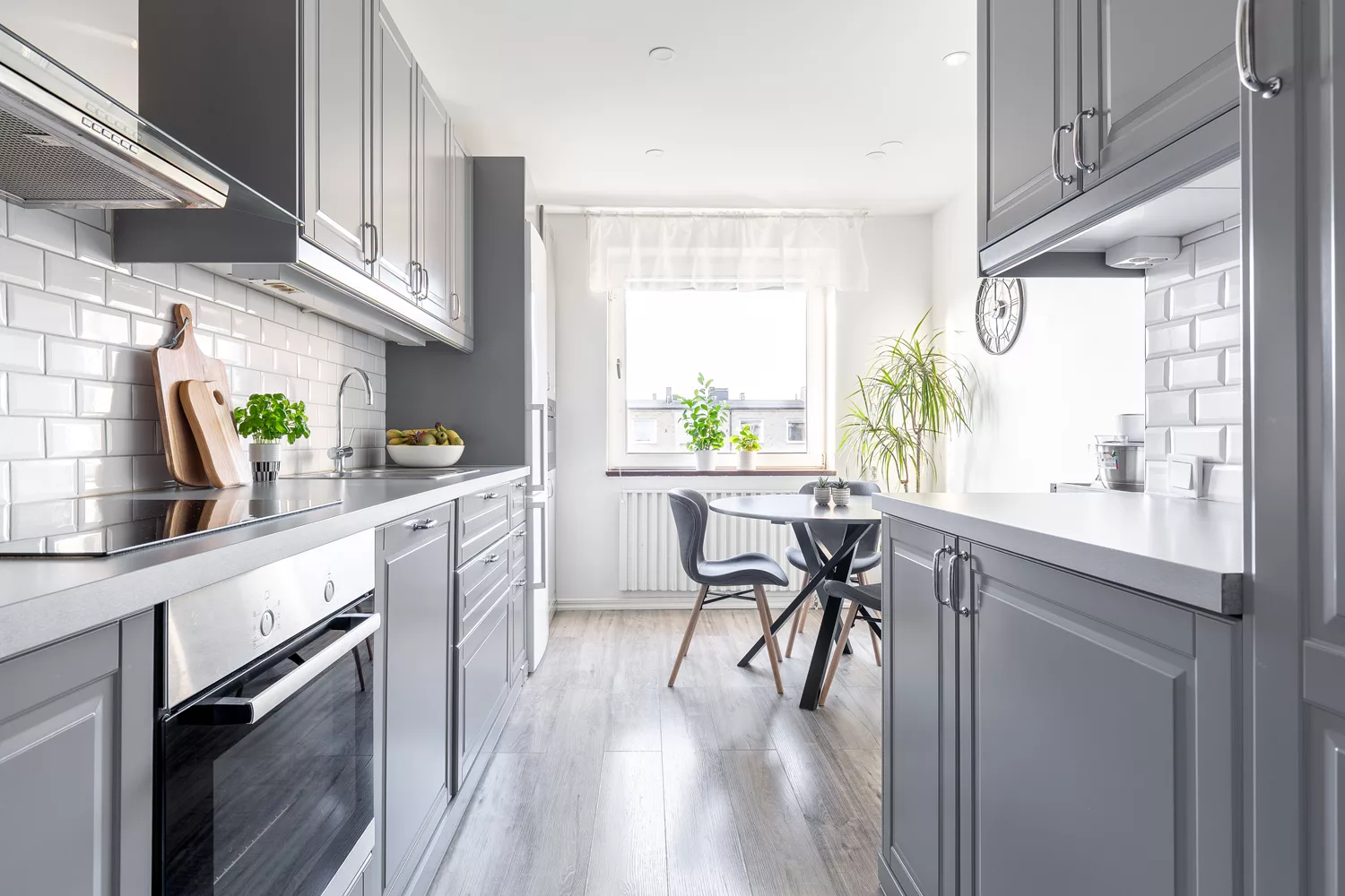 Laminatgolv och vita väggar. Modernt kök i snyggt grått tema. Utrustat med diskmaskin, kyl/frys, spishäll, fläkt och ugn. Här finns det goda arbetsytor och förvaring. Det finns plats för matbord för cirka 4-6 personer.