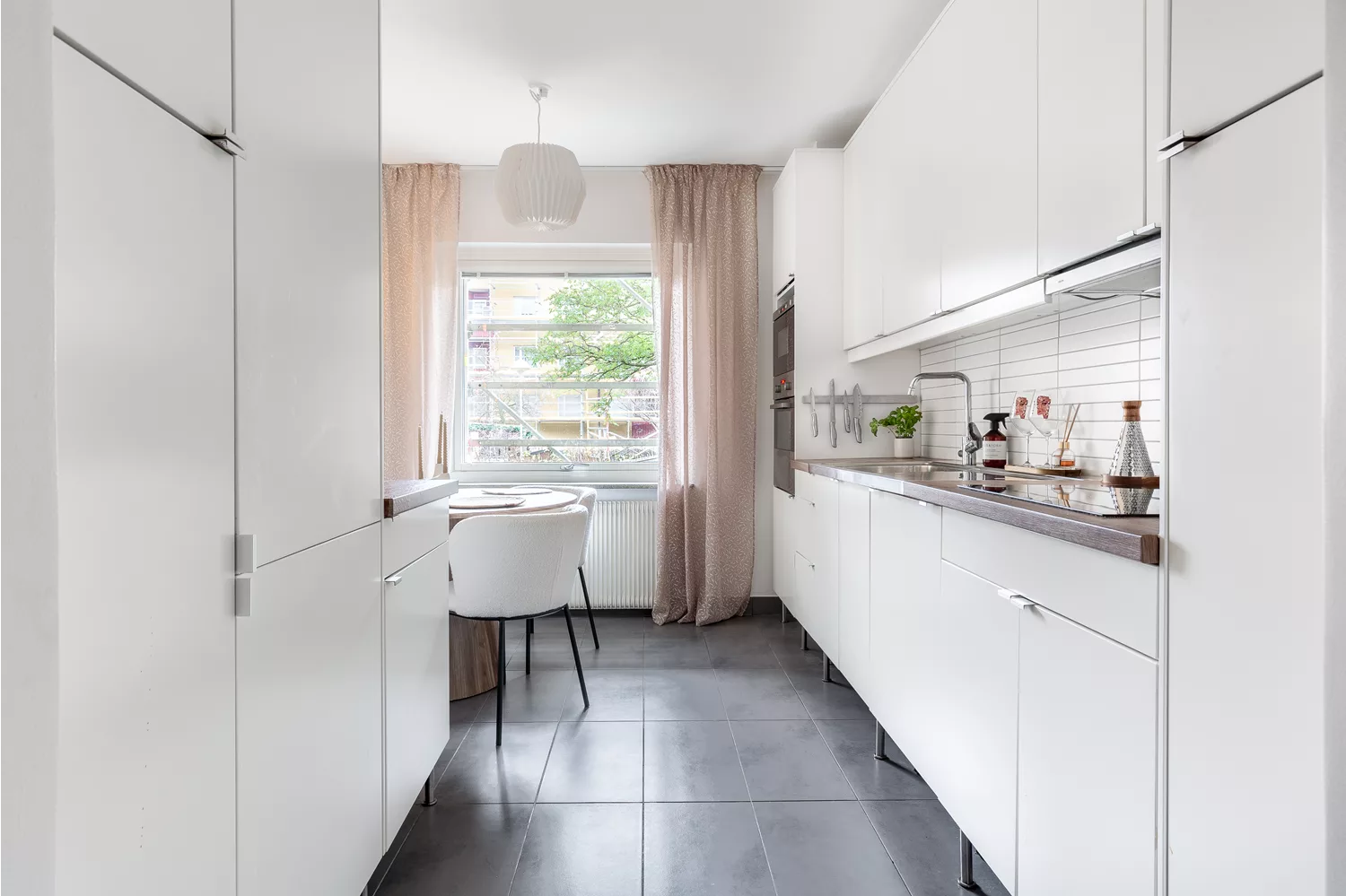Detta hem erbjuder en varm känsla med fina parkettgolv, mjuka beiga nyanser i samtliga rum och balkong i söderläge. Lägenheten har precis blivit försedd med alldeles nya fönster och ny balkongdörr. En halvtrappa upp nås bostaden och ni välkomnas in av en rymlig hall, direkt till höger skymtar köket med snygga vita luckor och bänkskiva i träimitation. Ett funktionellt kök med fin, modern estetik. Vidare in i vardagsrummet som blir hjärtat i bostaden med sin generösa storlek och balkongen i söderläge. Ett harmoniskt rum som ger den perfekta känslan för avkoppling.