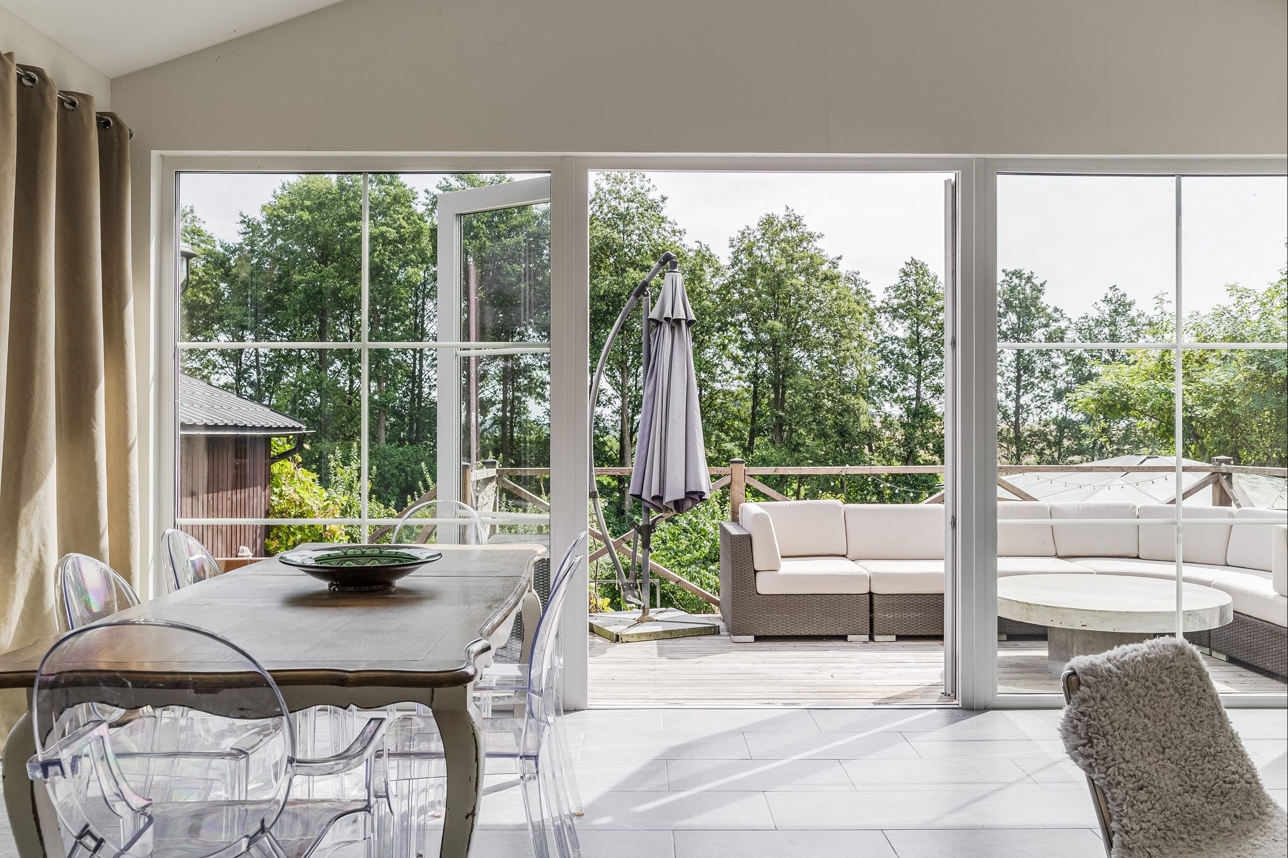 Flera uteplatser finns på tomten och trädgården stoltserar med gott om fruktträd, bärbuskar och vinrankor. Och utöver detta erbjuds ett stort garage om ca 30 kvm samt ett förråd om ca 15 kvm.