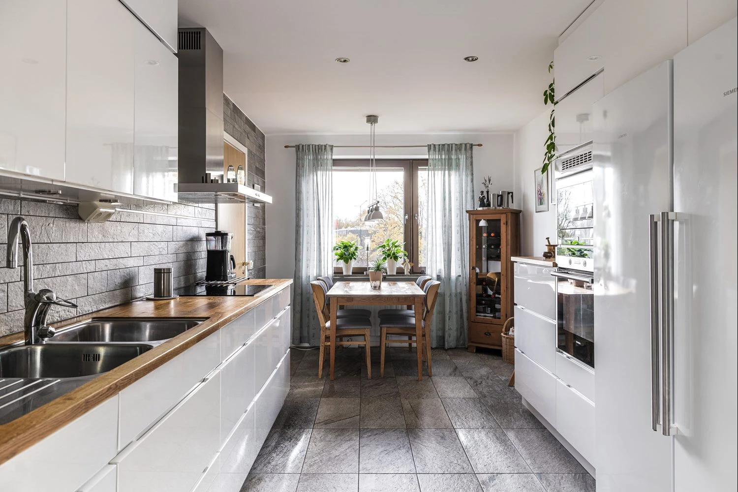 Klinker på golv och ljusa väggar. Köket är i vitt utförande med bänkskiva i trä. Utrustat med kyl, frys, ugn, micro, spishäll samt fläkt. Här finns plats för matbord för 4-6 personer.