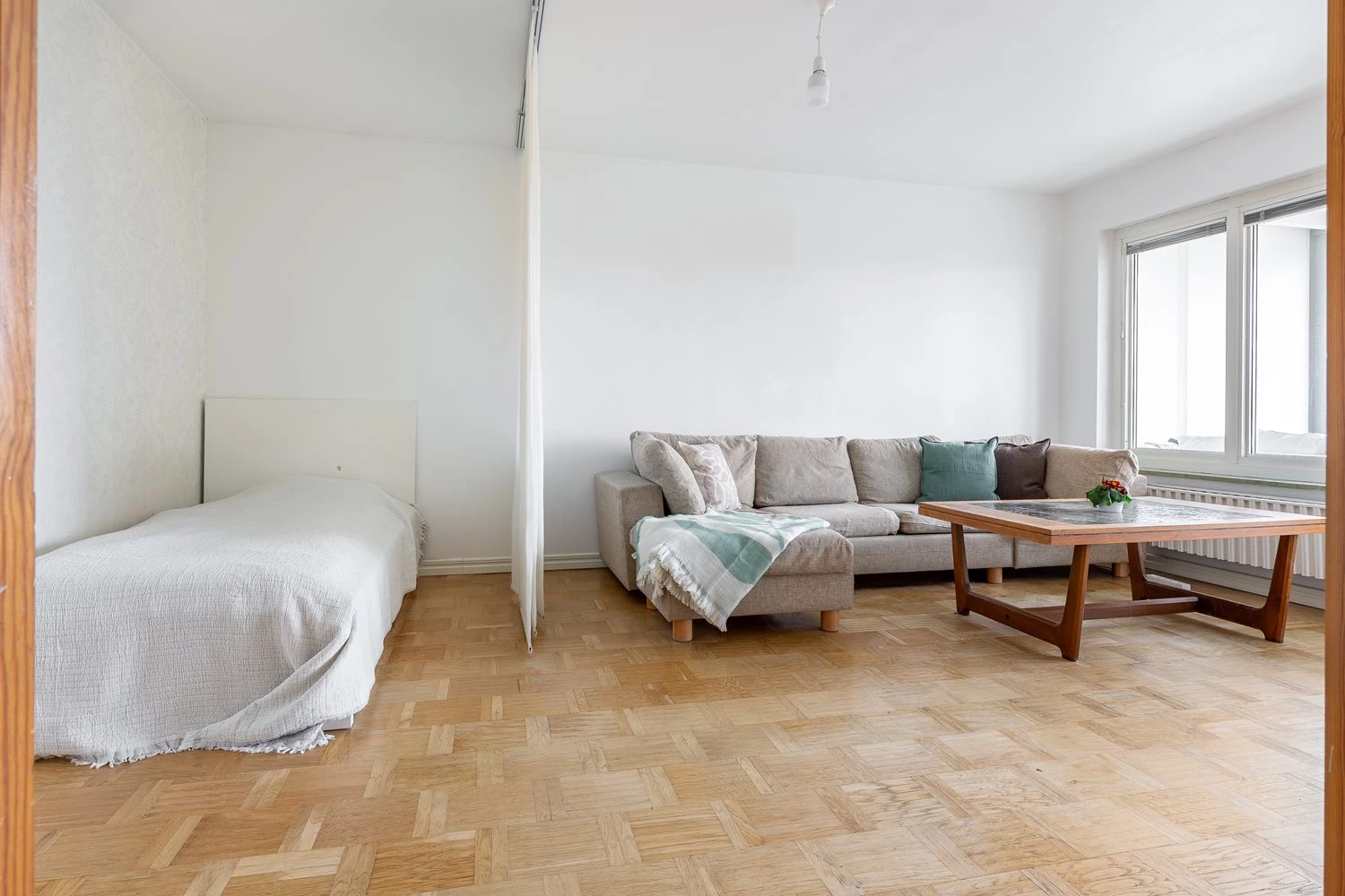 Parkettgolv och vita väggar. Här finns det plats för soffgrupp, säng, skrivbord, extra garderob om så önskas. Sovutrymmet är avskärmat med gardiner i dagsläget. Finns även möjlighet att bygga till en alkov om så önskas. Härifrån nås en stor inglasad balkong i österläge.