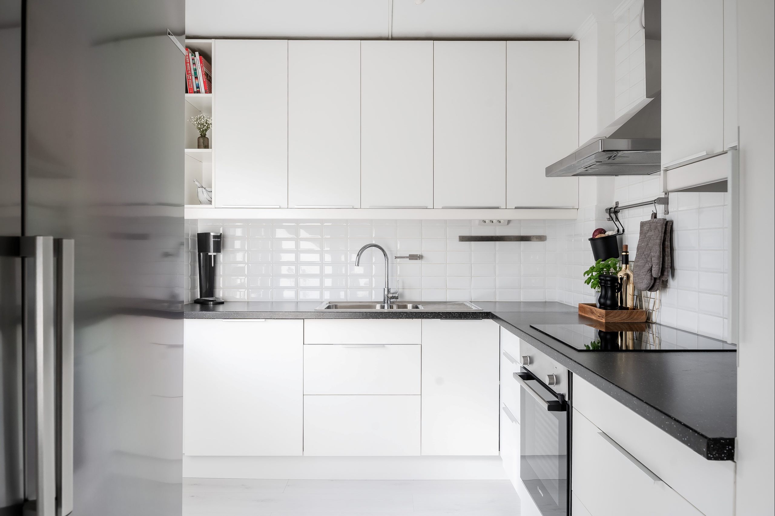 Kök i vitt utförande, laminatgolv och vita väggar. Fullt utrustat kök med plats för matbord för 4-6 personer. Köket är utrustat med kyl, frys, ugn, spishäll, fläkt, mikro och diskmaskin.