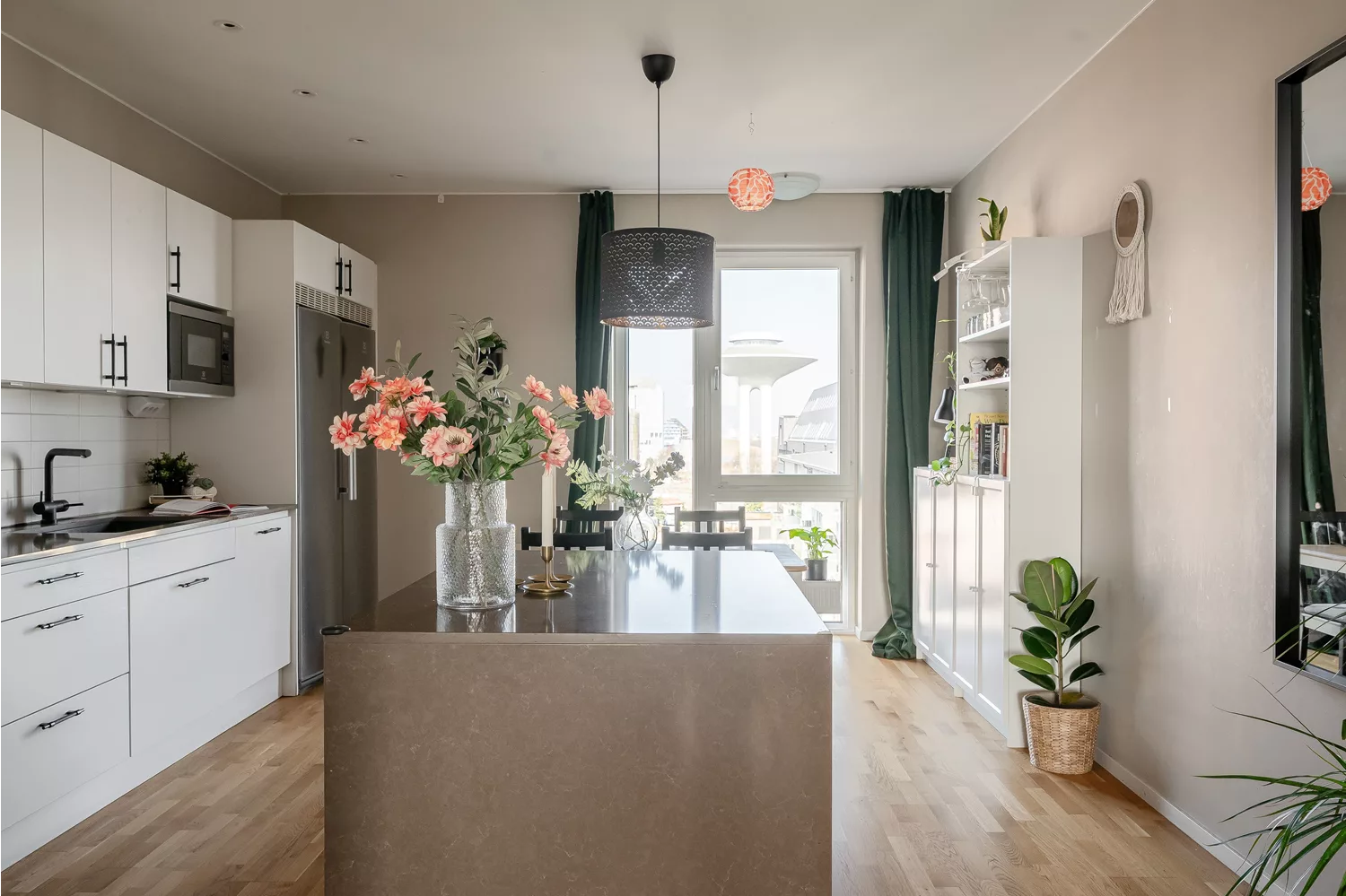 Här bor ni insynsskyddat i en lägenhet med mycket dagsljus, stora fönsterpartier i två vädersträck och trevliga ytor. Förutom en solig balkong och fin utsikt erbjuds ett högkvalitativt kök som är höjdpunkt nummer två i lägenheten. Kök från Vedum i vitt utförande med stilrena svarta handtag, klädd i en exklusiv bänkskiva i sten liksom köksön som ger extra arbetsyta och binder ihop köket snyggt. Här finns integrerad diskmaskin och hel kyl & frys i rostfritt stål. Från köket skymtas vattentornet som avger fint ljus på kvällarna.